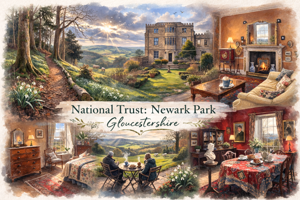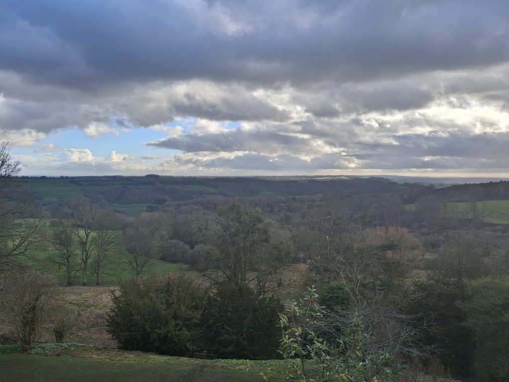 Hoch über dem Tal gelegen bietet Newark Park eine beeindruckende Aussicht. An klaren Tagen kann man bis zu den Mendip Hills sehen – rund 50 Kilometer entfernt. Es hat etwas Besonderes, in Gloucestershire zu stehen und so weit in die Landschaft zu blicken – Felder, die sich bis zum Horizont staffeln, Hügel und Baumreihen, die im blassen Winterlicht verschwimmen.